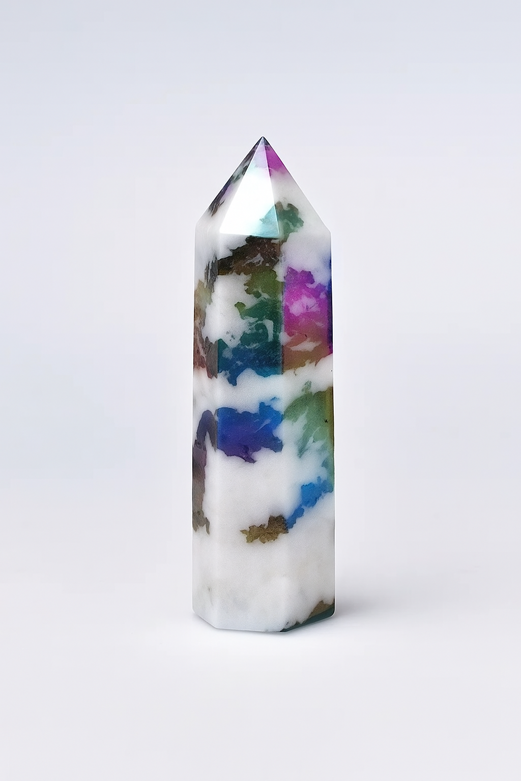Der Regenbogen Howlith verbindet die beruhigende Energie von Howlith mit der inspirierenden Kraft bunter Mineralien. Er fördert Gelassenheit, löst kreative Blockaden und unterstützt emotionale Ausgeglichenheit.